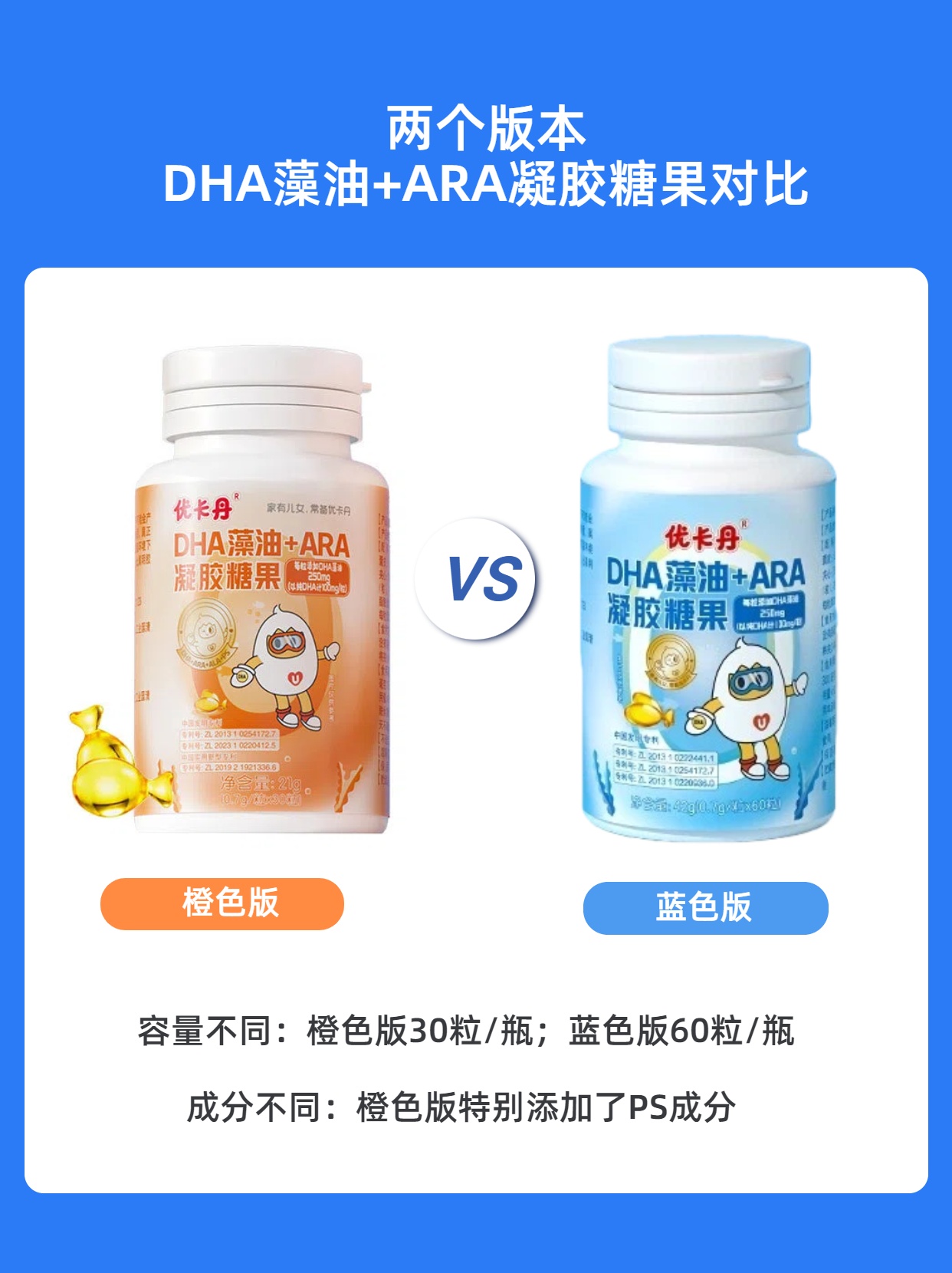 普通橙色版為30粒裝,每日2粒只夠半個月用量。寒假通常持續(xù)30-45天,藍色版60粒大容量設(shè)計,正好完整覆蓋整個假期,媽媽們再也不用擔心孩子“營養(yǎng)斷糧”。